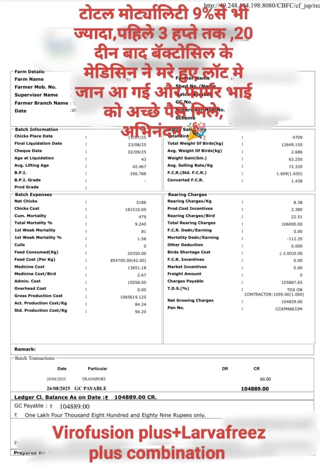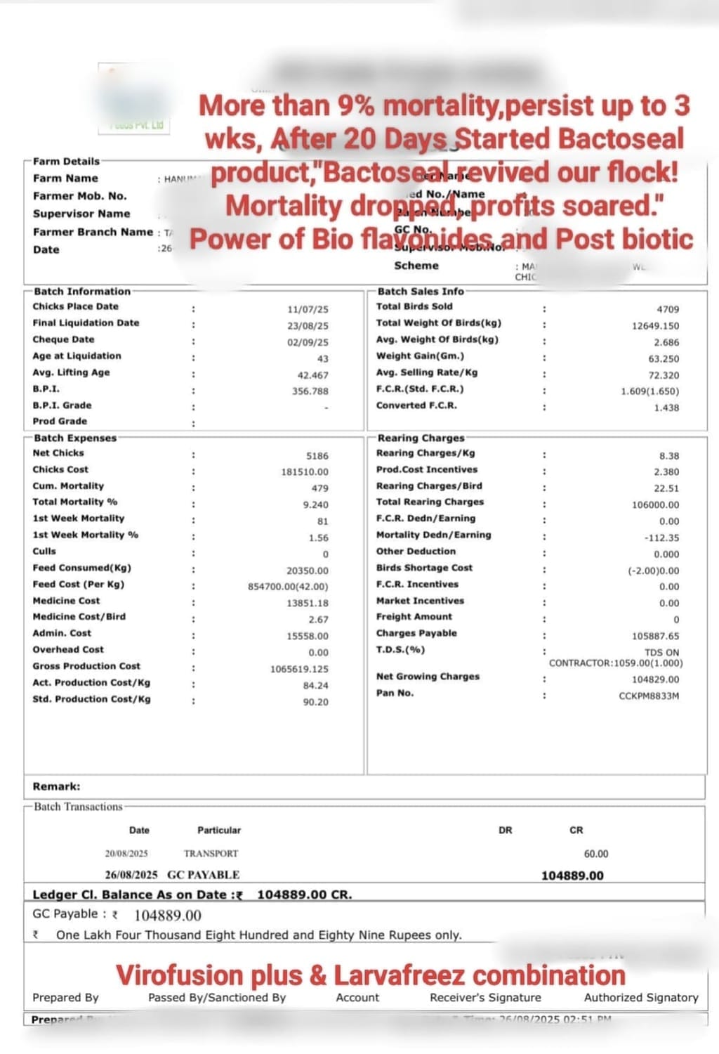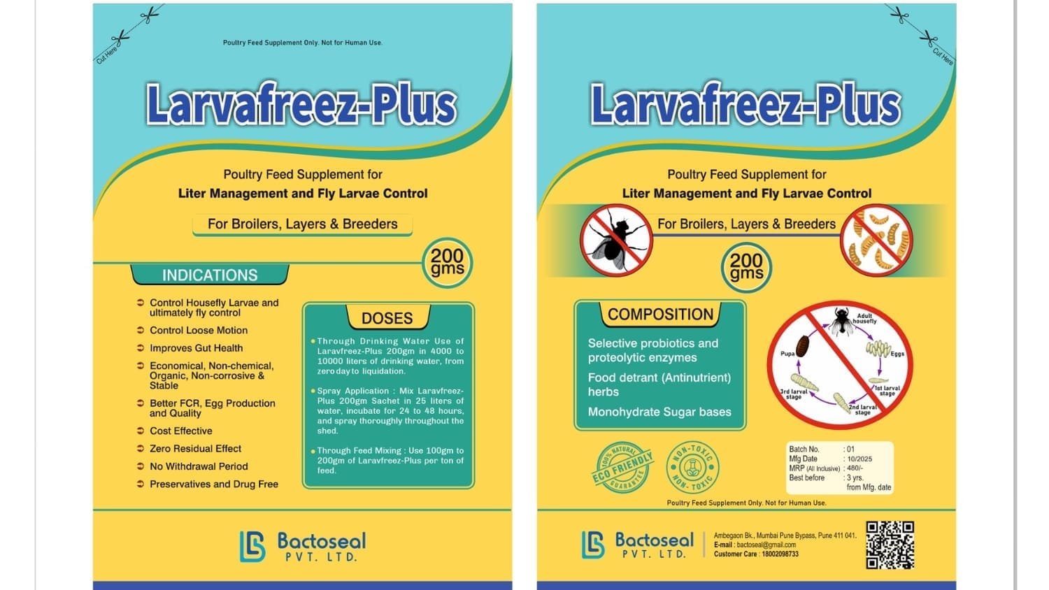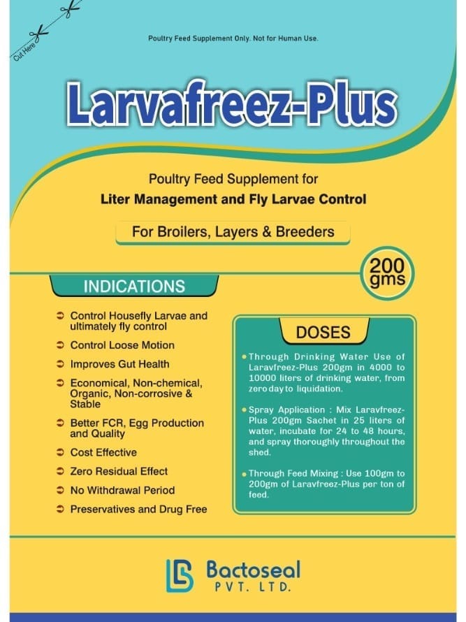 🤵1.Bactoseal Larvafreez-plus fly control medicine is very useful and environment friendly. I have been giving larvafreez-plus medicine to birds through water from last fifiteen days due to this, The infestation of flies is very less.The loose motion of birds are very less.So I would like to say a big thank you to the bactoseal team.