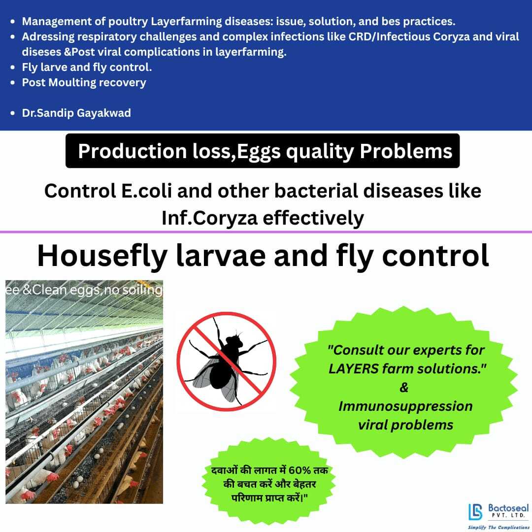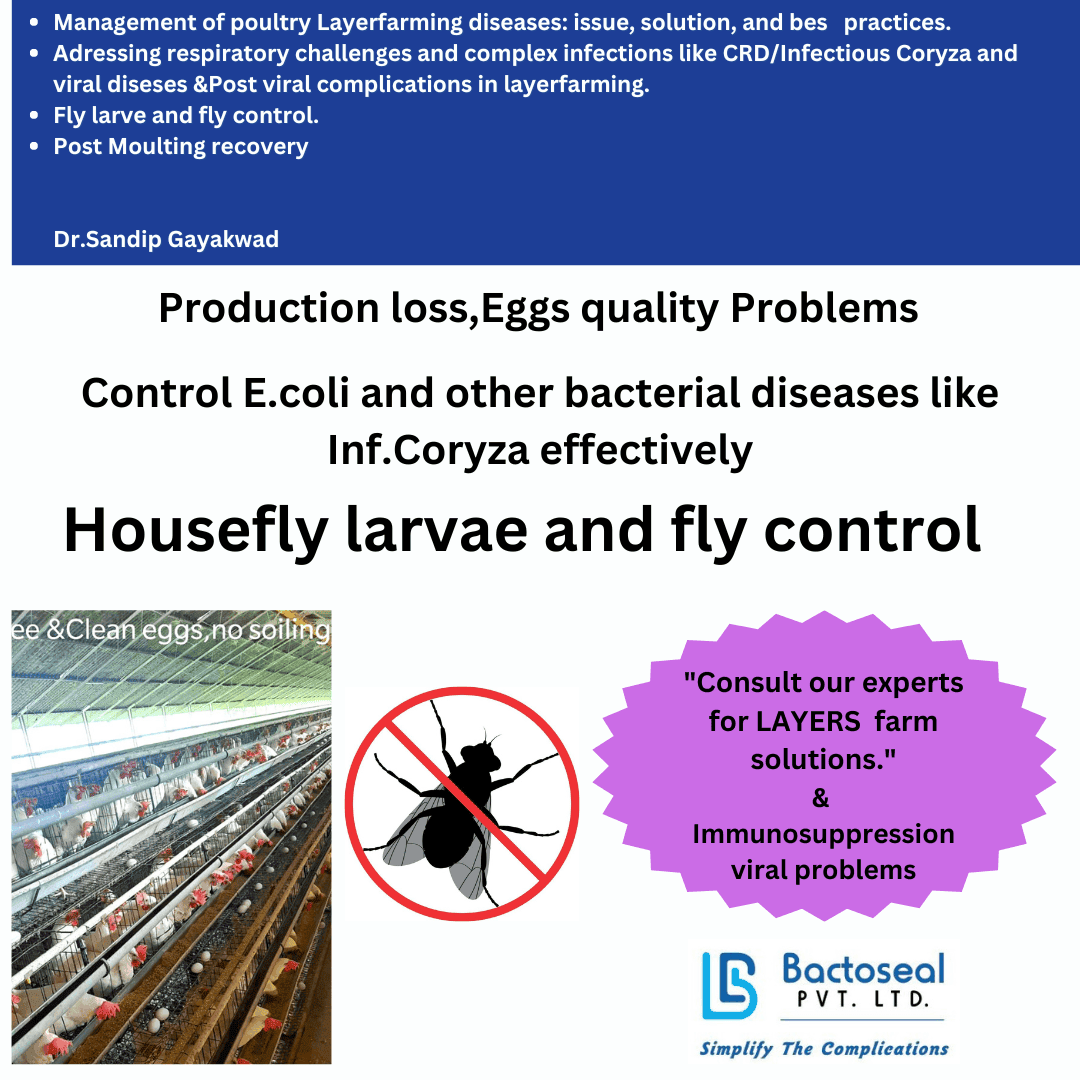 Addressing bacterial infections like collibacillosis and Complex like CRD/Infectious Coryza,Housefly larvae,Viral Outbreaks & Post Viral complications in layer poultry farming